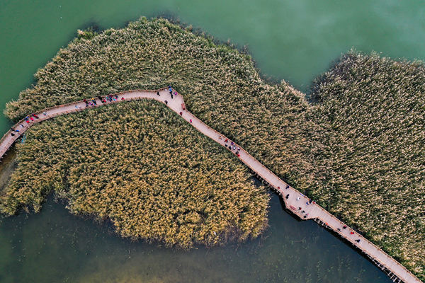 2021年10月17日,游客在居延海景區游玩(無人機照片)。新華社記者 劉磊 攝