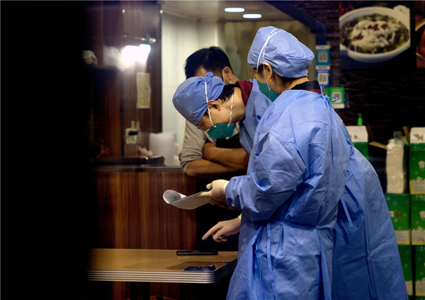 3月17日凌晨,上海市青浦區疾控中心流調人員在相關場所進行排摸。新華社記者 劉穎 攝