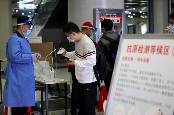 3月27日,在合肥火車站出站大廳,出站旅客領取免費發放的抗原檢測試劑。新華社發(解琛 攝)
