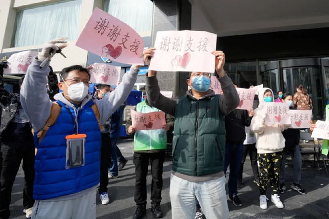 ????“謝謝!感謝你們對閔行的支持!”閔行區委書記陳宇劍來到集散點迎接醫療隊,并抱拳致謝。虹橋鎮的工作人員也打出“熱烈歡迎杭州中醫院白衣天使”等標語迎接。