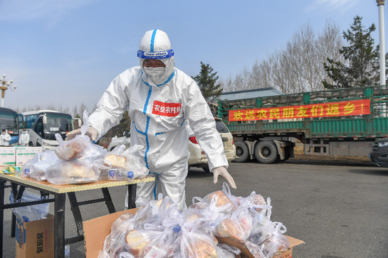 4月9日,在吉林市高速公路口,工作人員為返鄉農民準備餐食。長春市、吉林市正加快為滯留兩市的農民發放通行證,并組織多種轉運方式,盡快讓符合條件的農民返鄉備春耕。新華社記者 張楠 攝