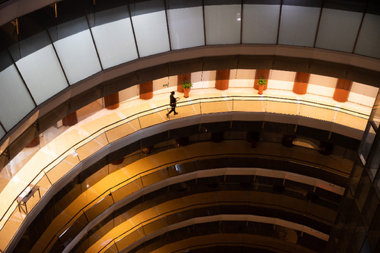 5月4日,在浦東陸家嘴平安金融大廈,平安資產管理有限責任公司員工陳吉佶和同事開完視頻會議后,走回辦公室。