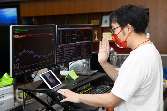 5月4日,在浦東陸家嘴平安金融大廈,平安銀行資金運營中心員工林飛一邊監測人民幣匯率變化,一邊通過視頻和同事開會。