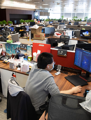 5月4日,在浦東陸家嘴平安金融大廈,平安銀行上海分行員工沈曦和同事費家浩在辦公室值班。