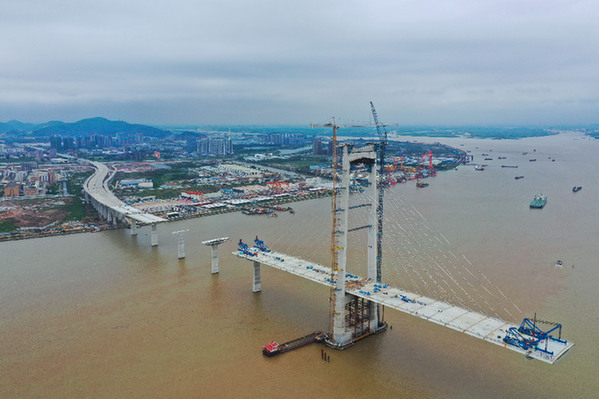 正在進行箱梁架設的深中通道中山大橋建設現場(5月15日攝,無人機照片)。