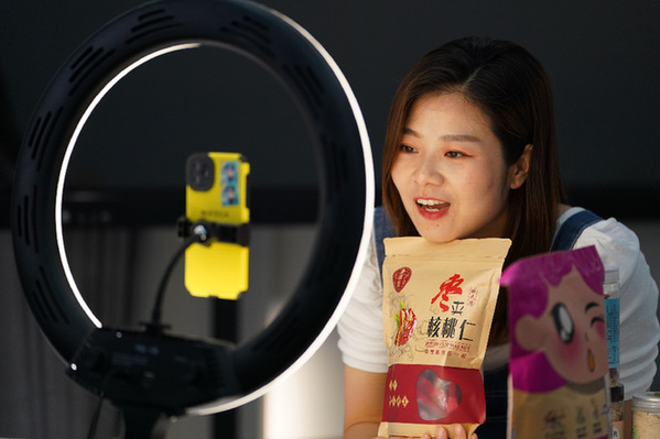 5月12日,殘疾人網絡主播渭梅女在西安一家直播產業基地直播帶貨。