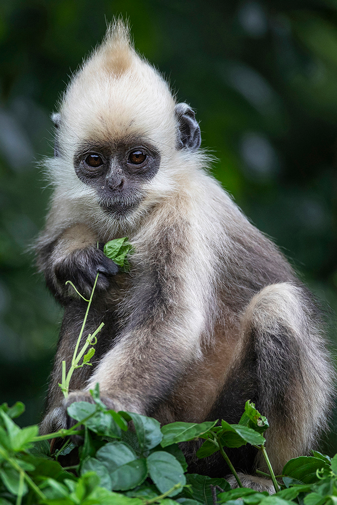 之所以叫“白頭葉猴”,是因為它們的頭部有一撮高聳的白色毛冠,且主要以樹葉為食。