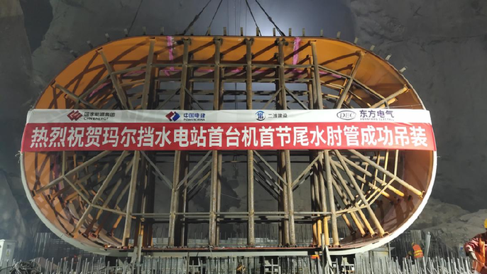 2022年5月25日10:58時,國家能源集團青?,敔枔跛娬緳C電安裝工程首臺大機(5#機組)尾水肘管首段(15、14管節)管節整體吊裝平穩落至5#機坑,順利實現了電站機電埋件期間首個重大節點目標,標志著瑪爾擋水電工程正式進入水輪發電機組埋件施工階段。