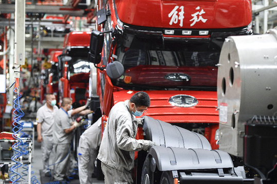 6月15日,工人在位于吉林長春的一汽解放總裝車間內裝配車輛。