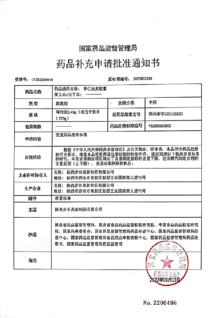 6月27日 ,步長高新“棗仁地黃膠囊”獲得國家藥品監督管理局批準的藥品補充申請批準通知書,批準變更藥品注冊標準,批準日期2022年06月13日,變更后的質量標準編號:YBZ00262022。