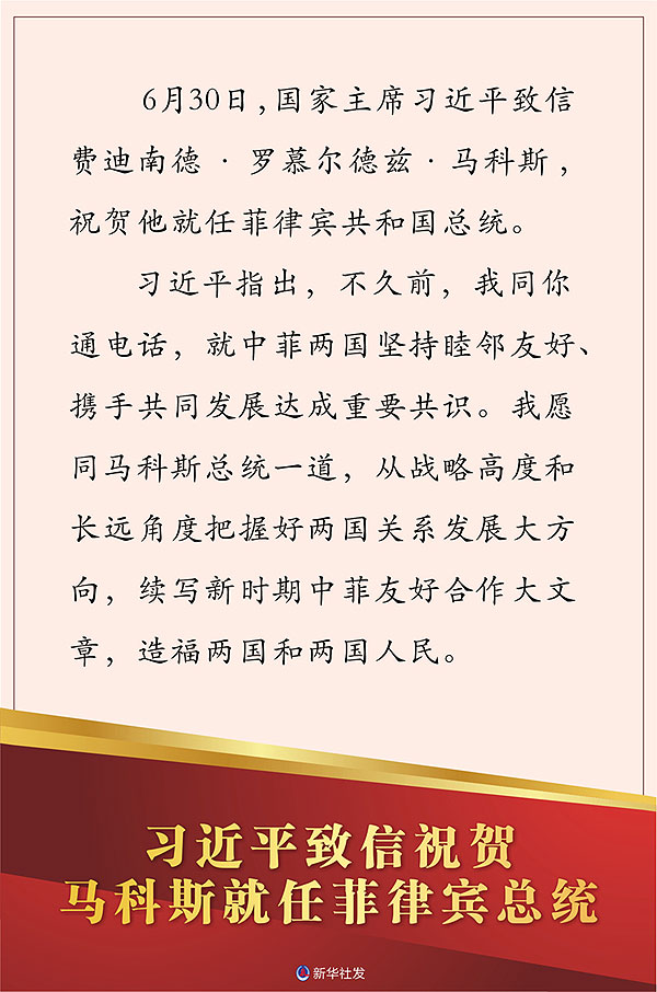 新華社北京6月30日電 6月30日,國家主席習近平致信費迪南德·羅慕爾德茲·馬科斯,祝賀他就任菲律賓共和國總統。
