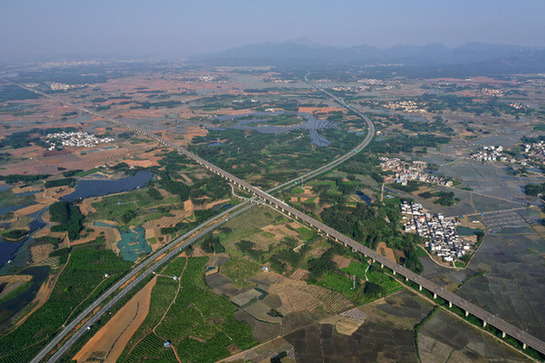 南廣高鐵和蒼碩高速在廣西賓陽縣古辣鎮交匯(2022年4月4日攝,無人機照片)。新華社記者 黃孝邦 攝