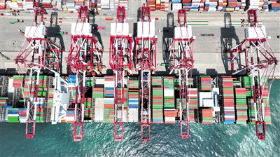 山東港口青島港前灣港區,一艘集裝箱貨輪在碼頭裝卸集裝箱。 記者 李紫恒 攝