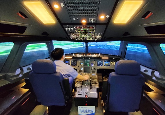 研究人員在全真模擬飛機座艙內測試航空器防撞產品(5月12日攝)。 陳冬冬 攝