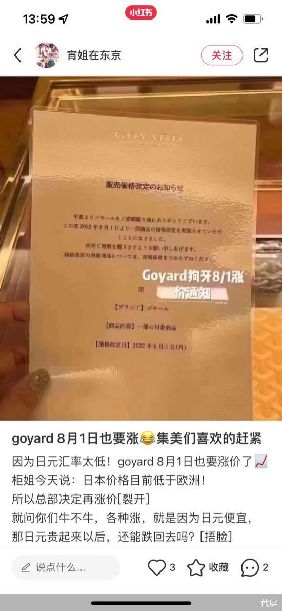 同時,由于日元貶值,奢侈品牌也在調高商品在日本的售價,漲價前,品牌也將迎來銷售熱潮。據一位小紅書博主發布內容,goyard在日本將于8月1日漲價,當前goyard產品在日本的售價低于同款在歐洲的售價。