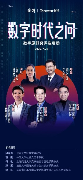 首屆數字原野獎將“數字時代之問”作為本年度獎項的主題,邀請北京大學社會學系教授邱澤奇、牛津大學社會人類學教授項飆、復旦大學國際關系與公共事務學院教授鄭磊、上海交通大學安泰經濟與管理學院教授何帆、美國卡內基梅隆大學計算機學院人機交互所研究員沈虹五位大眾影響力和學術影響力兼具的學者擔任數字原野獎學術顧問。