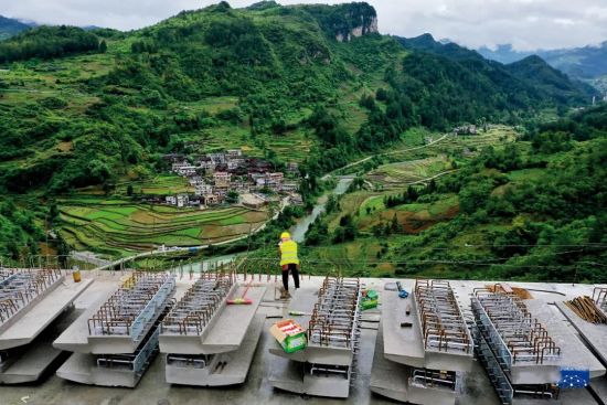 5月25日,貴南高鐵最高橋桐子園雙線特大橋的橋面系施工現場。圖/新華