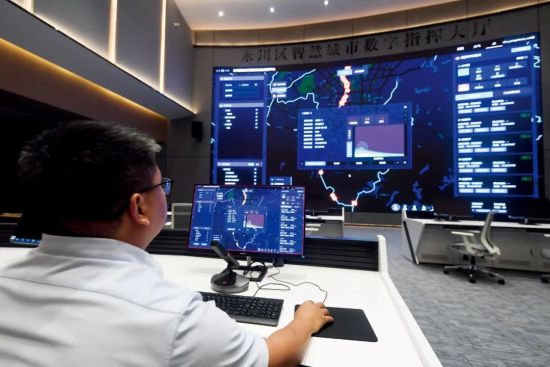 5月7日,在重慶市永川區智慧城市數字指揮大廳,工作人員利用生態環境智慧綜合監管平臺進行監測、分析。圖/新華
