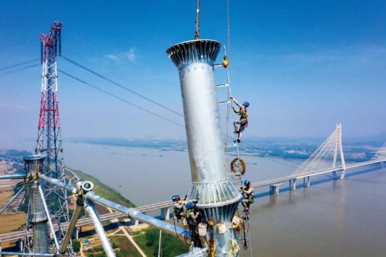 5月25日,安徽送變電工程有限公司施工人員在長江大跨越施工現場作業。圖/新華