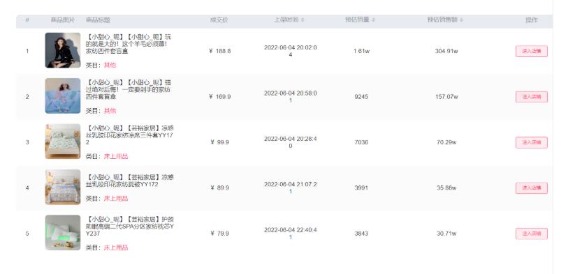 在節日大促之外,我們也看到蘑菇街主播在家紡、養生保健等品類專場中的帶貨力極高。以蘑菇街主播“小甜心_呢”為例,她在6月4日舉辦的家紡專場,單場直播GMV預估近千萬,銷量預估達6.61萬。床上四件套、乳膠涼席套裝、枕芯、夏被等單品在小甜心直播間熱賣,其中,銷量最高的四件套單品熱銷預估1.61萬: