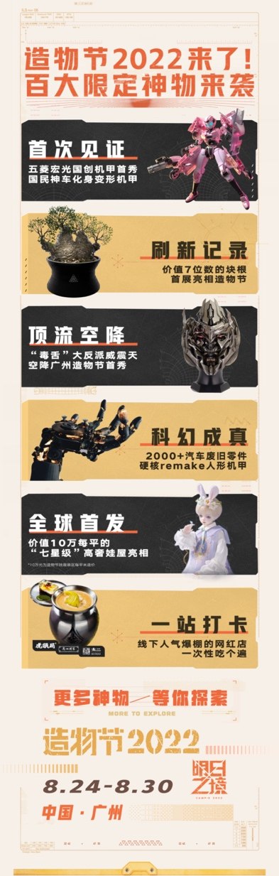 在會場,主辦方還打造了全感式互動設計,觀眾可通過店鋪互動穿戴設備尋找神物能量,沉浸式穿越火線,360度深度體驗“游戲化”的營地探險。同時,今年造物節線上線下緊密融合,不能親臨現場的網友也能在線上4D逛展,一起加入這場燃爆的“創意嘉年華”,共同感受中國年輕人迸發的創造力。