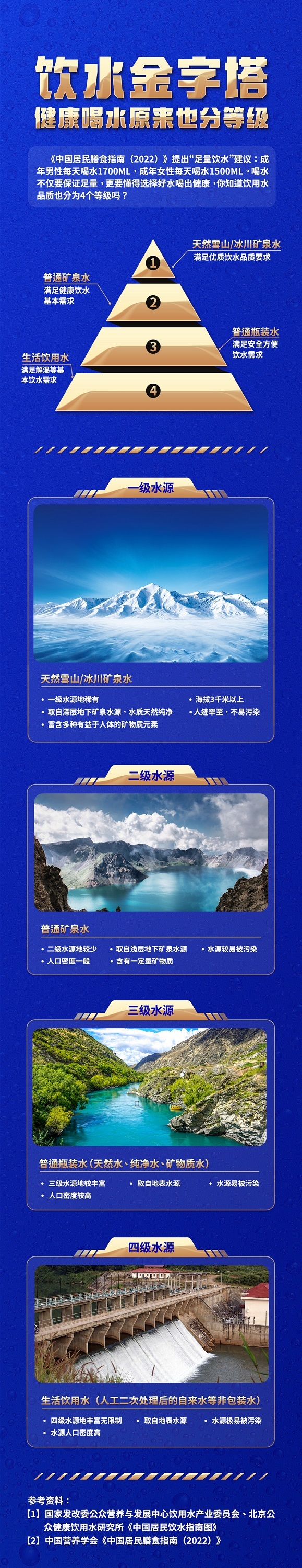健康時報官方平臺發布了飲水金字塔科普長圖,以水源地為核心標準將日常飲用水分為四級,包括高海拔雪山冰川礦泉水、普通礦泉水、江河湖泊水及自來水。雪山/冰川礦泉水作為一級好水,大多來自于海拔3000米以上的雪山冰川地區,富含均衡豐富的礦物質,長期飲用對健康大有裨益。