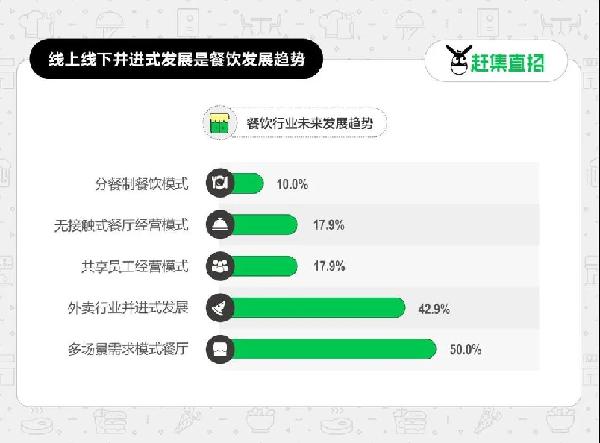 調研報告指出,對于從業者而言,開展多場景融合經營方式可有效緩解疫情帶來的經營壓力,堂食+外賣的線上線下并進式發展是餐飲業的主流趨勢。