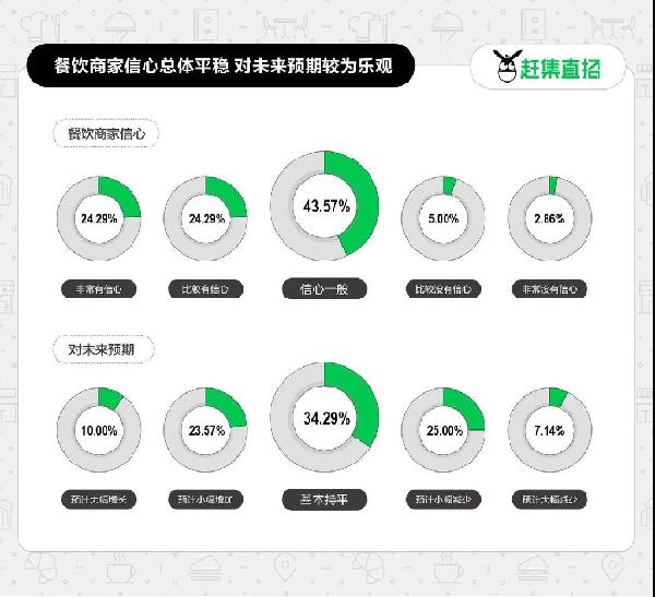 不難看出,在消費需求的帶動下,餐飲商家收入仍具有較大發展空間,從業者普遍持樂觀情緒。趕集直招數據顯示,近五成餐飲業受訪者表示對2022年餐飲消費發展有信心,67.86%的餐飲業受訪者認為2022年餐飲消費可以基本持平或呈現增長趨勢,其中有33.57%的受訪者認為2022年餐飲消費會出現增長。