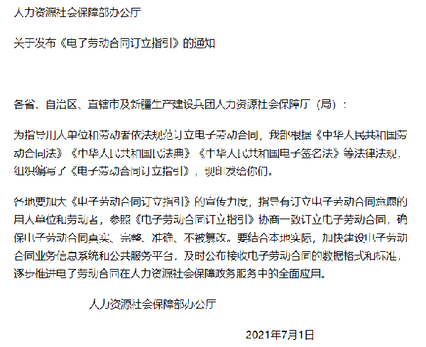 人力資源社會保障部辦公廳在2021年7月發布《電子勞動合同訂立指引》的通知,如下:
