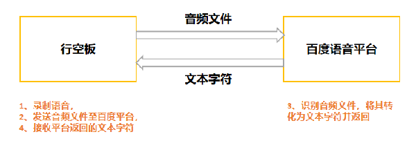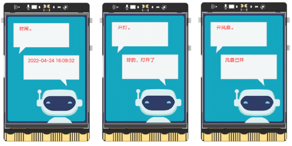 具體功能和操作如下,首先,將LED燈、風扇外接到行空版上,之后給行空板配置網絡,接著編寫并運行程序,在行空版屏幕上顯示背景圖和初始信息后,按下板載按鍵錄制語音,等待行空板依據程序自動將語音上傳至百度語音平臺并返回得到語音對應的文字內容,隨后對文字內容進行判別,當其中有“時間”兩個字時,自動檢測系統的時間并更新顯示在行空板的屏幕上,而當文字內容中有“開燈”、“關燈”、“開風扇”、“關風扇”、“開鬧鐘”、“關鬧鐘”等信息時,行空板控制LED等、風扇、板載蜂鳴器執行相應的操作。