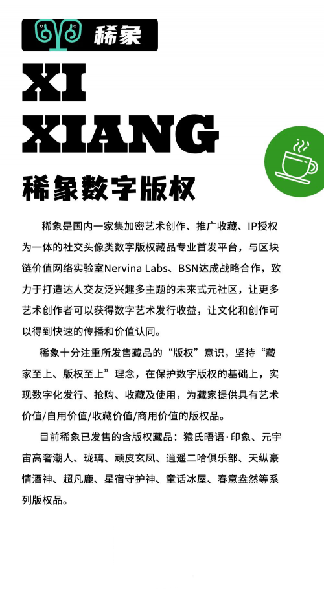 稀象一直相信以政策為主導的版權IP交易市場,才是數藏流轉市場的最后歸宿。并且始終堅定如一地相信,好的版權IP一定是能夠連續產出版權價值,以及成為具有真正收藏意義的稀缺版權作品。
