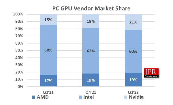 對于GPU,Intel自然是不陌生的,在PC顯卡市場上其實一直占據著領先地位。根據權威市調機構Jon Peddie Research的數據,2021年第一季度,Intel在PC GPU顯卡市場上的份額高達68%,2022年第一季度依然有60%。