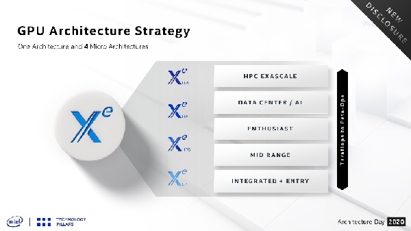 為此,Intel設計了全新的Xe GPU架構,并細分為主打集成顯卡和入門獨顯的超低功耗Xe LP、針對游戲優化的高性能圖形Xe LPG、面向數據中心和AI應用的高性能Xe HP、適合超級計算的高性能計算Xe HPC四種微架構,