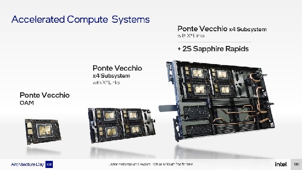Xe HPC架構,首款產品代號Ponte Vecchio,多工藝多芯片整合封裝,已經出貨,將與下一代可擴展至強Sapphire Rapids聯手用于百億億次級超級計算機Aurora。