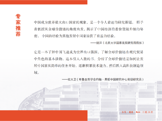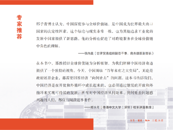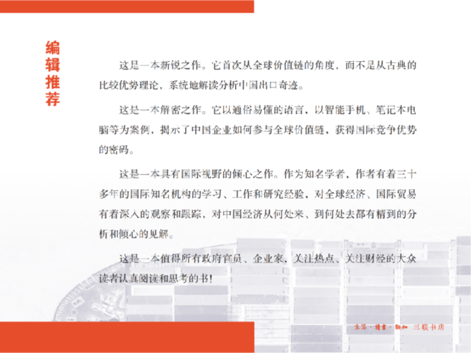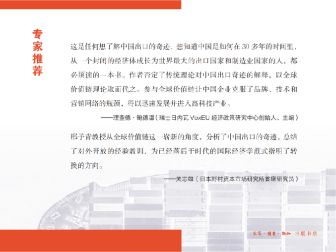 該書作者邢予青是日本國立政策研究大學院大學經濟學教授,研究全球價值鏈十余年。不同于李嘉圖的比較優勢理論、赫克歇爾-奧林模型或者保羅·克魯格曼教授提出的基于規模經濟的新貿易理論,該書第一次以全球價值鏈為框架,從中國企業在全球價值鏈中扮演的角色出發,揭示了跨國公司的技術、品牌和市場營銷網絡對中國出口奇跡形成的決定性作用,闡述了全球價值鏈如何推動中國出口快速增長的機制。