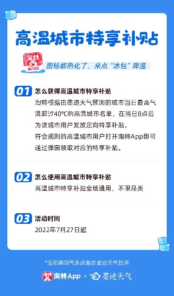 618“滿30減5”玩法火遍全網后,近日淘特又給消費者帶來新驚喜:發高溫補貼冰紅包。淘特冰紅包發放始于7月27日,具體玩法是,淘特與墨跡天氣APP合作,通過夏日促銷節每天向氣溫達40℃城市消費者發放特享冰紅包。