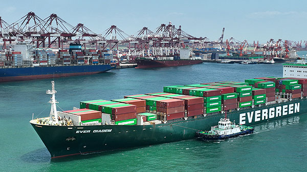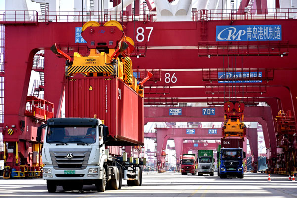 山東港口青島港前灣港區,一艘集裝箱貨輪正進港靠泊碼頭。