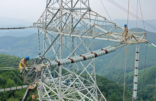 閩粵電力聯網線路工程日前全線貫通,實現福建電網與廣東電網物理“牽手”。圖為國網福建省送變電工程有限公司施工人員在閩粵電力聯網線路工程現場作業。