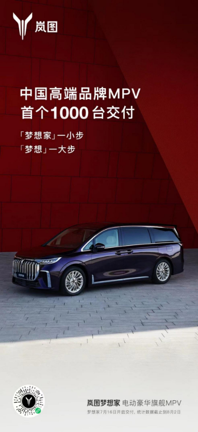 ??就在論壇開幕的前一天,嵐圖電動豪華旗艦MPV嵐圖夢想家完成第1000臺用戶交付,也因此成為中國高端電動MPV市場首個累積交付破千的品牌。