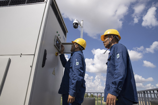 在大慶油田星火水面光伏示范工程現場,工作人員檢查光伏配套設備。新華社記者 張濤 攝
