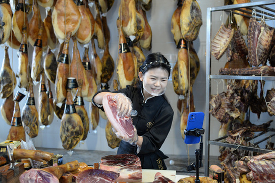 在老浦家火腿公司,工作人員正在直播銷售火腿。記者 楊靜 攝