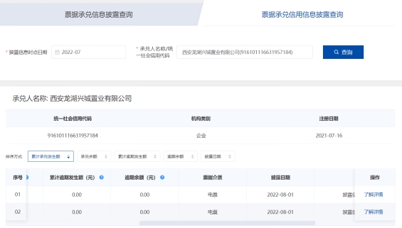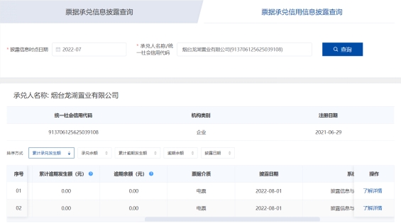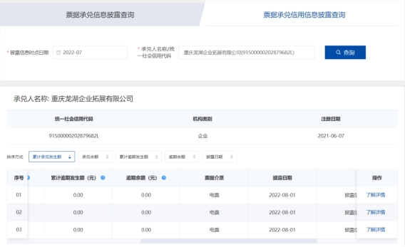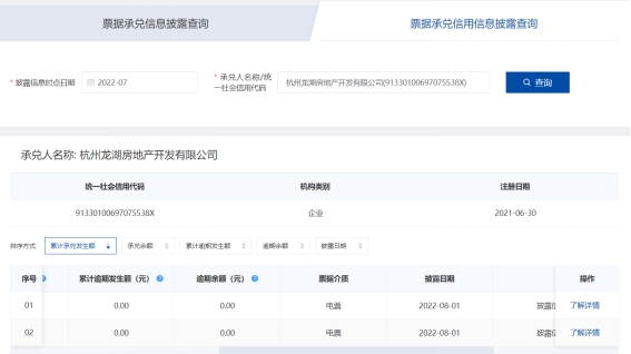 登錄上海票據交易所票據信息披露平臺查詢龍湖集團票據信息相關主體公司顯示,嘉興龍湖嘉韜房地產開發有限公司、煙臺龍湖置業有限公司、重慶龍湖企業拓展有限公司等5家公司均無逾期記錄。