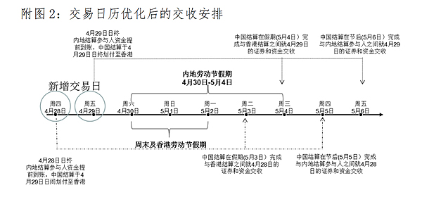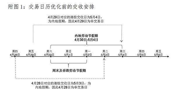 以今年的“五一”假期為例:4月28日和4月29日兩地均開市,本地投資者在當地市場都可交易。但由于香港市場是T+2完成證券和資金的交收,上述交易日對應的港股交收日分別是5月3日和4日,為內地假期,不能辦理結算業務。因此,這兩天不能進行港股通交易。而交易日歷優化后,4月28日和29日內地投資者也可以通過港股通買賣港股標的的證券。