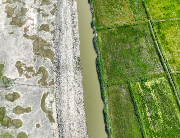 鎮賚縣稻田(右)與鹽堿灘涂一處交界(2022年7月12日攝,無人機照片)。潘晟昱 攝