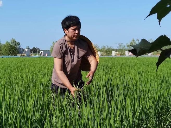 白城市鎮賚縣慶江種養殖農民專業合作社經理張瑞平在田中清理水藻。(潘晟昱 攝)