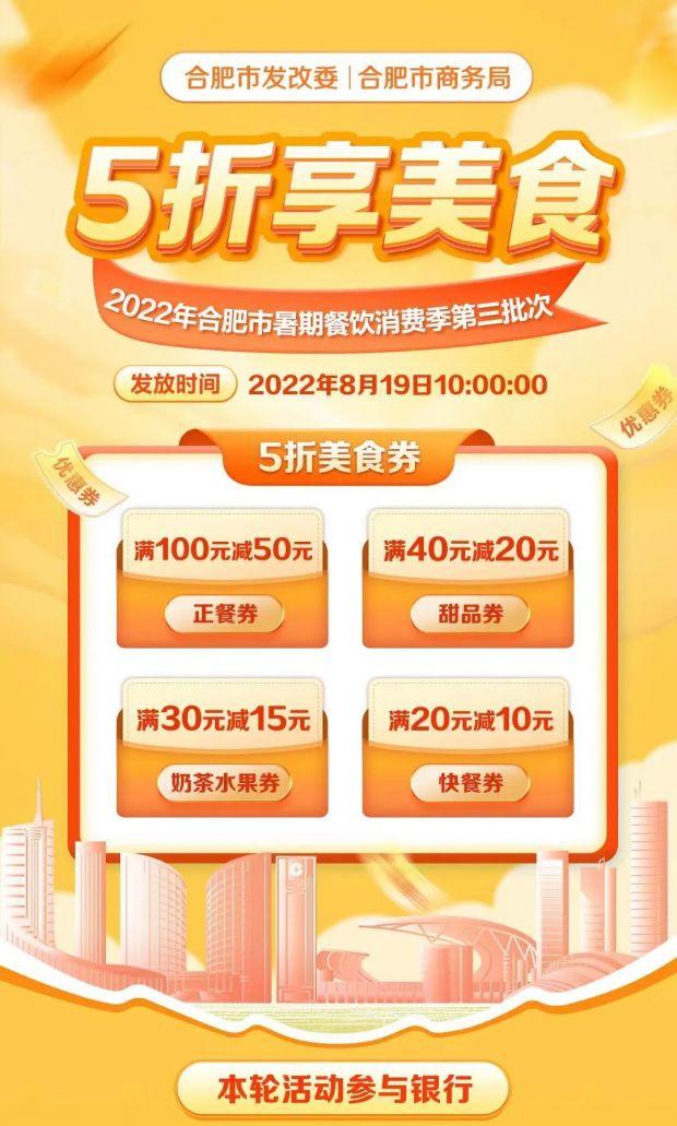 合肥也于8月19日開始發放暑期消費季第三批消費券,共計1844萬元。據了解,此次發放的是餐飲消費券,分為滿100元減50元正餐券、滿40元減20元甜品券、滿30元減15元奶茶水果券和滿20元減10元快餐券,采取電子券形式發放,消費者可通過登錄多家銀行APP領取。