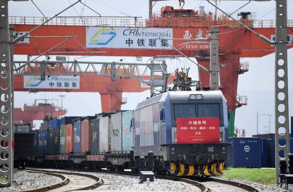8月23日,陜西首趟中越國際貨運班列準備從西安國際港站出發開往越南河內。