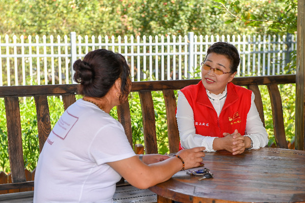 8月24日,吳亞琴(右)與團山街道長山花園社區的樓棟黨支部書記李杰聊天。新華社記者 張楠 攝