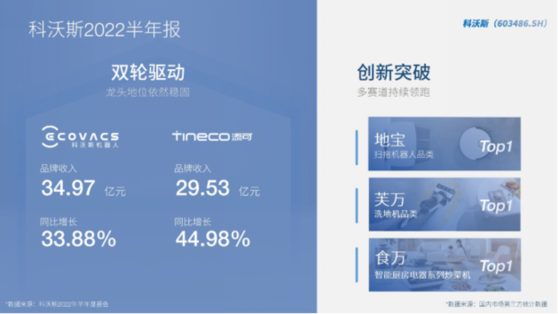 2022年8月26日晚間,科沃斯(603486.SH)發布2022年半年報。報告顯示,作為科沃斯旗下高端智能生活電器新銳品牌TINECO添可,實現銷售收入29.53億元人民幣,占全部收入的43.28%,較上年同期增長44.98%。