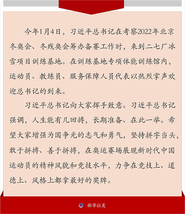 習近平總書記向大家揮手致意。習近平總書記強調,人生能有幾回搏,長期準備、在此一舉。希望大家增強為國爭光的志氣和勇氣,堅持拼字當頭,敢于拼搏、善于拼搏,在奧運賽場展現新時代中國運動員的精神風貌和競技水平,力爭在競技上、道德上、風格上都拿最好的獎牌。